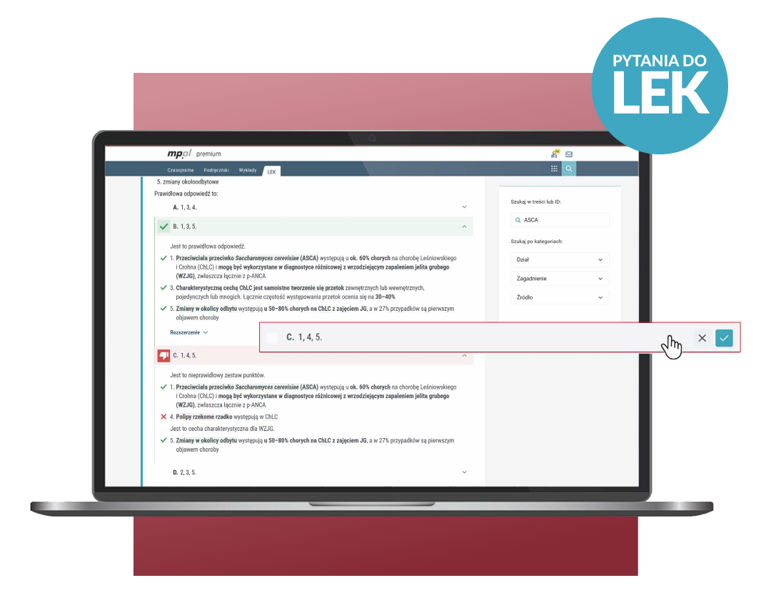 - Moduł LEK: pełna baza pytań do LEK wraz ze szczegółowymi aktualizowanymi komentarzami i dostępem do materiałów źródłowych.
